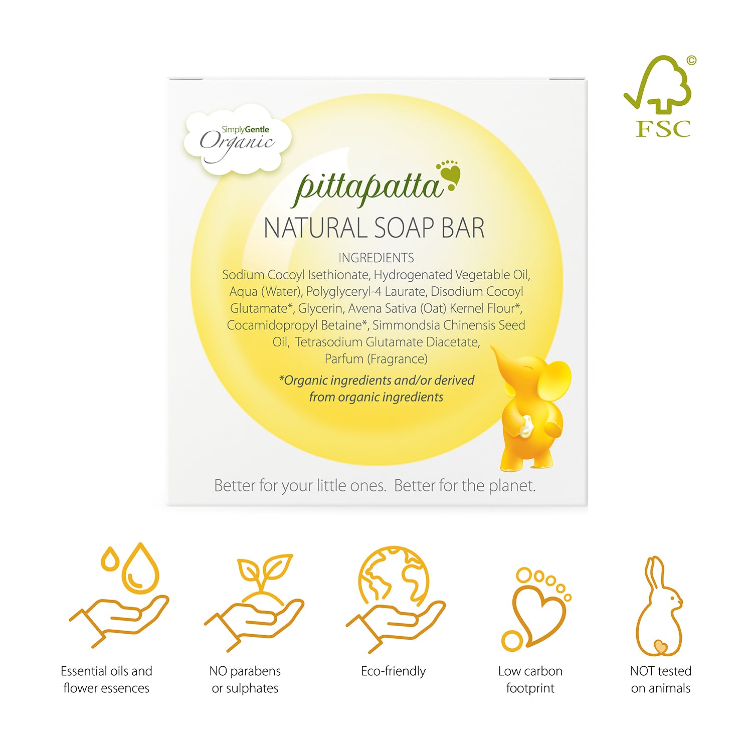 Introducing the Pittapatta Natural Soap Bar from the Simply Gentle Organic range, a thoughtfully crafted soap enriched with natural and organic ingredients, specifically designed for practical baby and infant care. Opting for our Simply Gentle Organic baby and infant products means more than just tending to your little ones; it means caring for the environment in which they thrive.